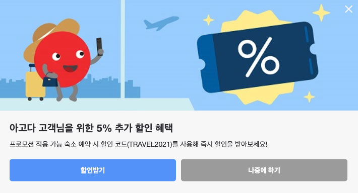 - 5% off TRAVEL2021 호텔만 예약시 5% 할인적용