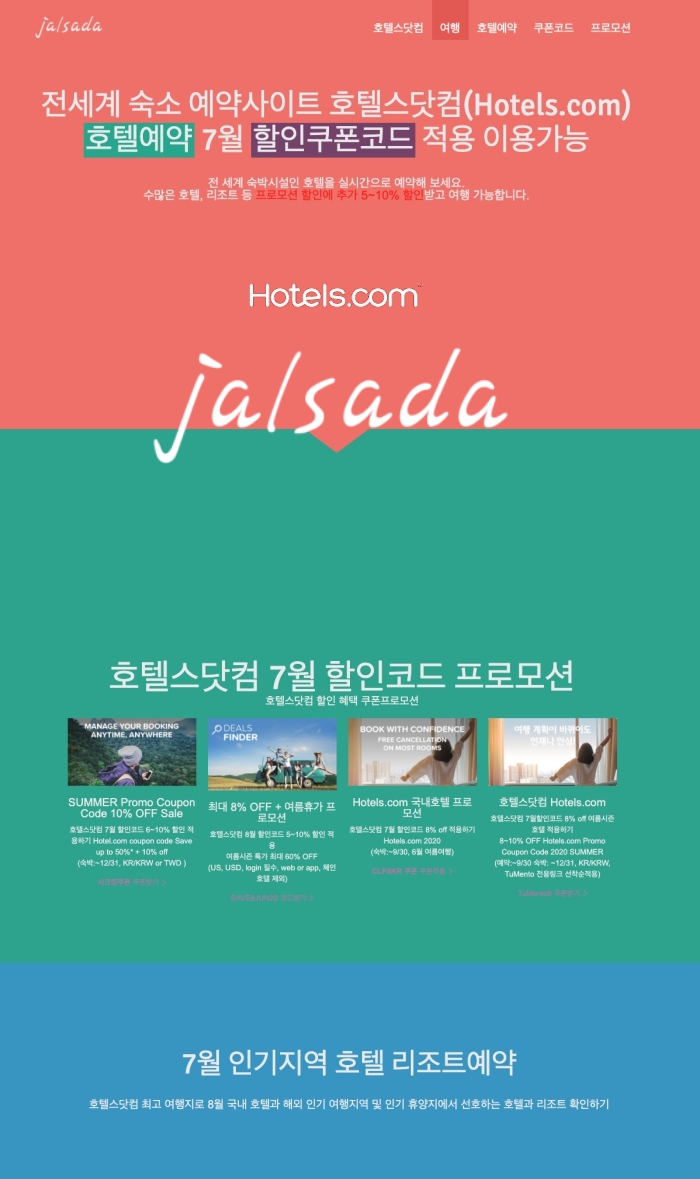 일단 국내버전은 원화로 호텔스닷컴 프로모션이 아니고 호텔 및 숙박시설 자체 할인가격 특가 활용하는 것도 방법입니다.